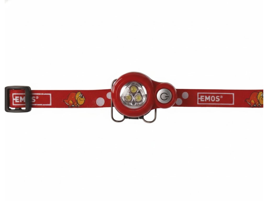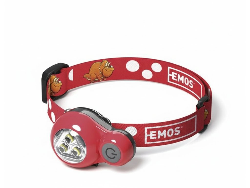 - Dětská voděodolná a nárazuvzdorná LED čelovka Emos Dino, součástí je kvalitní popruh pro upevnění na hlavičku, cyklistickou přilbu, apod.