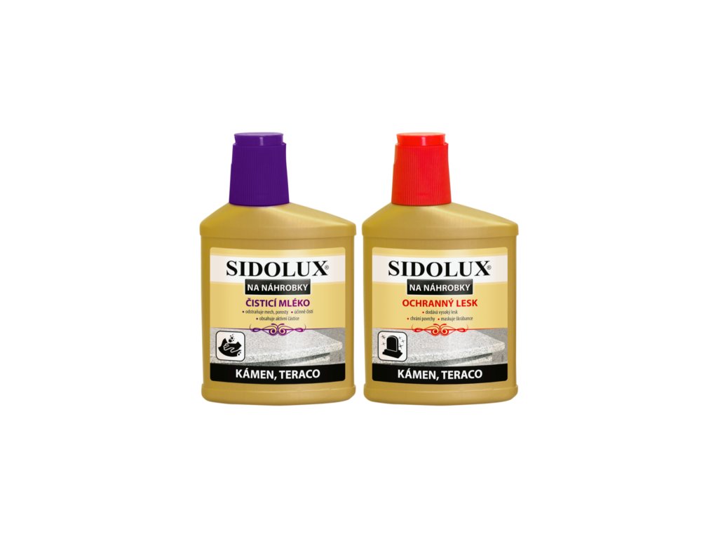 SIDOLUX na ošetření náhrobních kamenů (čistič + ochranný lesk) 330g + 250ml, je komplexní sada prostředků na čištění a ochranu povrchu náhrobních desek z přírodních porézních neleštěných materiálů. Čistící mléko je vhodné na čištění veškerých povrchů a to i leštěných, ochranný lesk lze použít pouze na povrchy neleštěné, porézní.