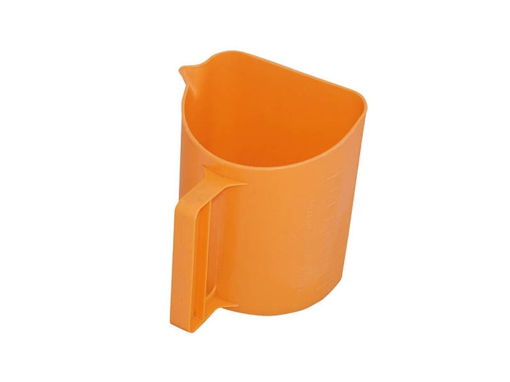 Odměrka je vyrobena z lehkého, ale odolného plastu, který se snadno udržuje a je vhodný pro časté používání. Vnější cejchování po 0,1 litru až do objemu 2 litrů umožňuje přesné odměření potřebného množství krmiva nebo granulí. Praktický tvar a nízká hmotnost z ní dělají ideální pomůcku pro použití v chovu, na dvoře i ve stáji.