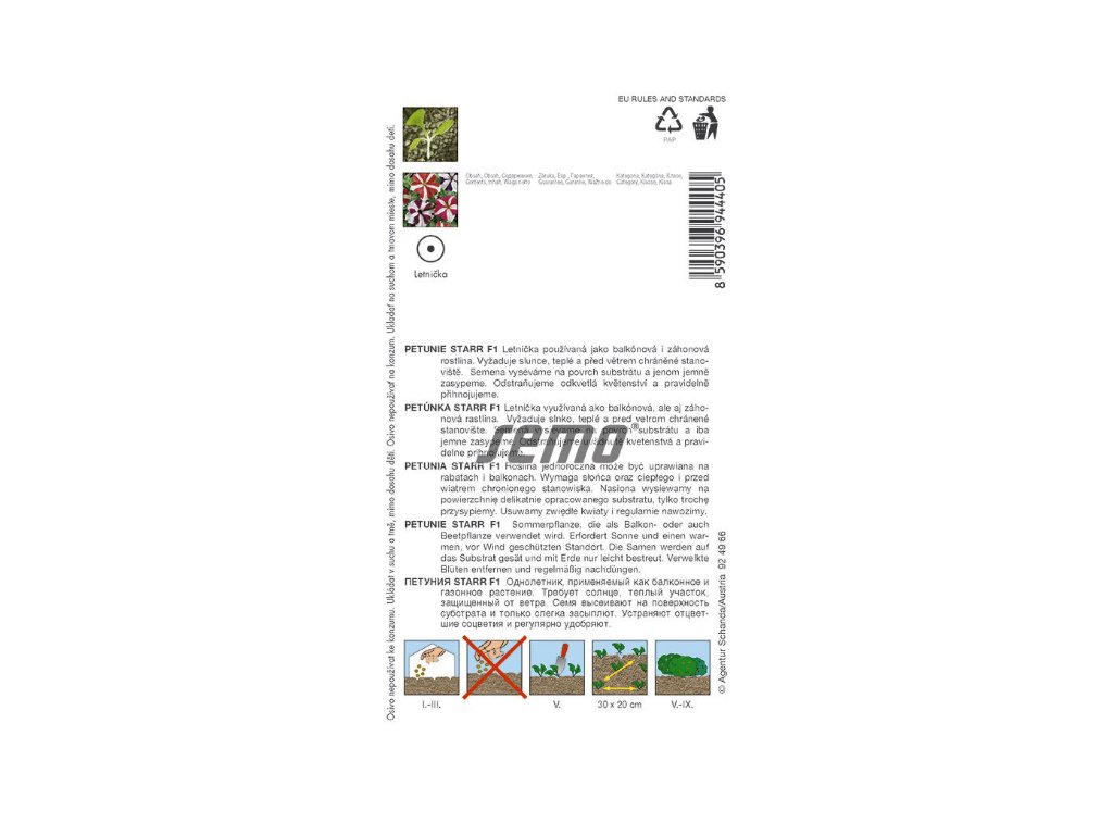 Oblíbená letnička vhodná do okenních truhlíků i k záhonovým výsadbám. Vyžaduje slunnou, teplou polohu a výživnou humózní půdu. Nesnáší větrné stanoviště. Semeno sejeme na povrch jemně zpracovaného propařeného substrátu a jenom velice slabě zasypeme. Po třech týdnech přepikýrujeme a následně rozsadíme do hrnků. V průběhu vegetace odstraňujeme uvadlé květy a pravidelně přihnojujeme. Směs velkokvětých odrůd s výraznou bílou hvězdou v květu. Osivo je peletováno.