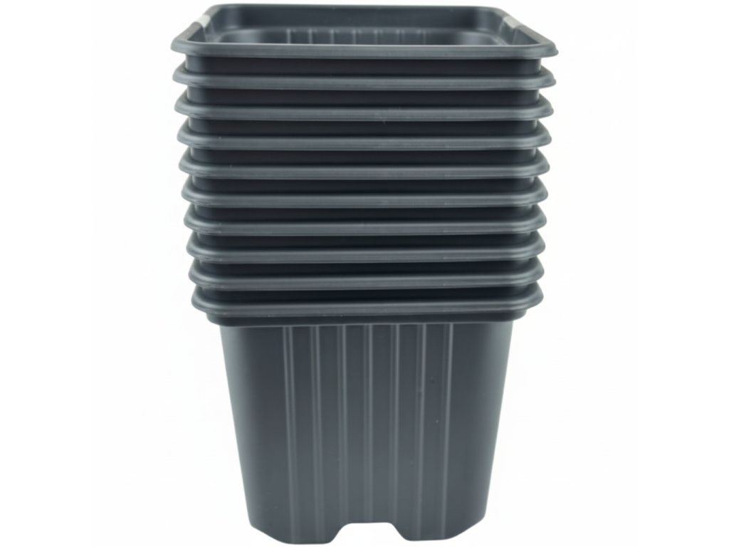 Hranatý plastový černý kontejner měkké kvality je určený především pro pěstování sazenic rostlin. Měkká kvalita znamená, že oproti pevné kvalitě nedrží tvar a je promáčknutelný. Používá se na výsadby. Baleno po 10-ti kusech včetně ean kódu.