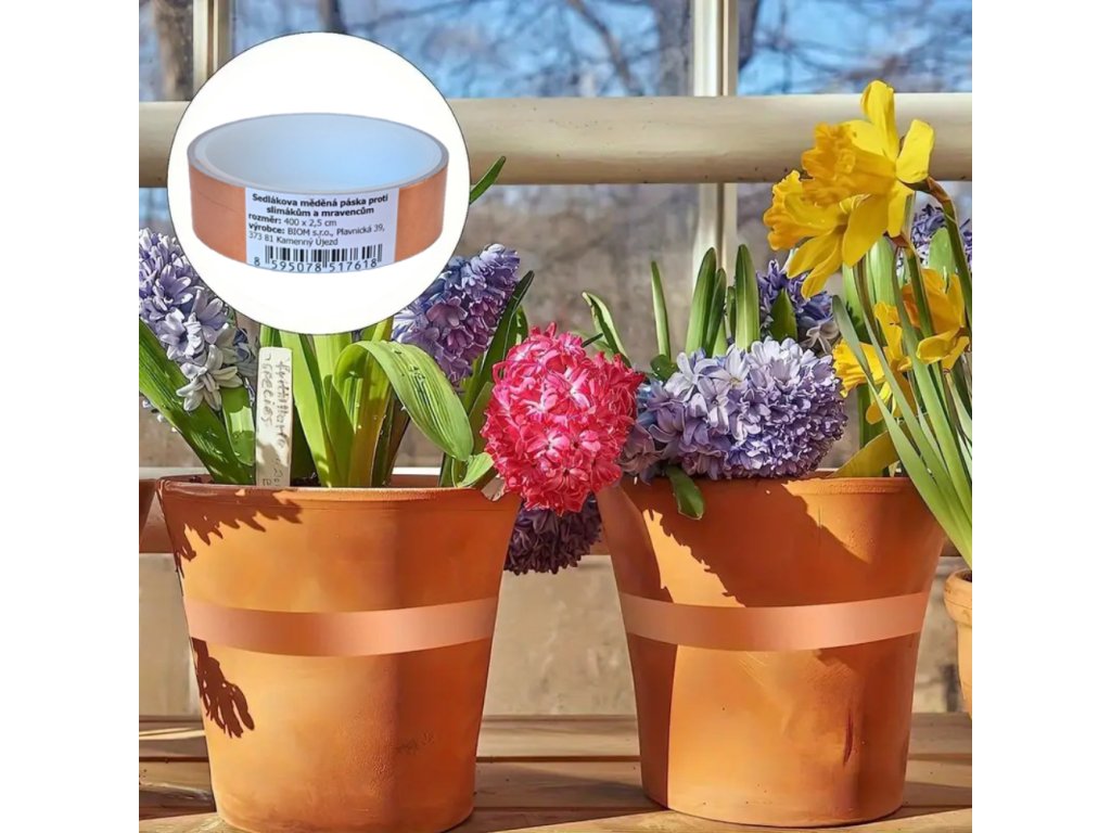 Poznámka - Měď na pásce se může časem zabarvit, ale to neovlivní její účinnost. Pokud použijete pásku na květináče, je důležité, aby se listy nebo stonky chráněné rostliny nedotýkaly země a slimák nemohl vylézt po nich. Stejně tak by rostlina neměla být blízko zdi nebo jiného místa přístupného slimákům.